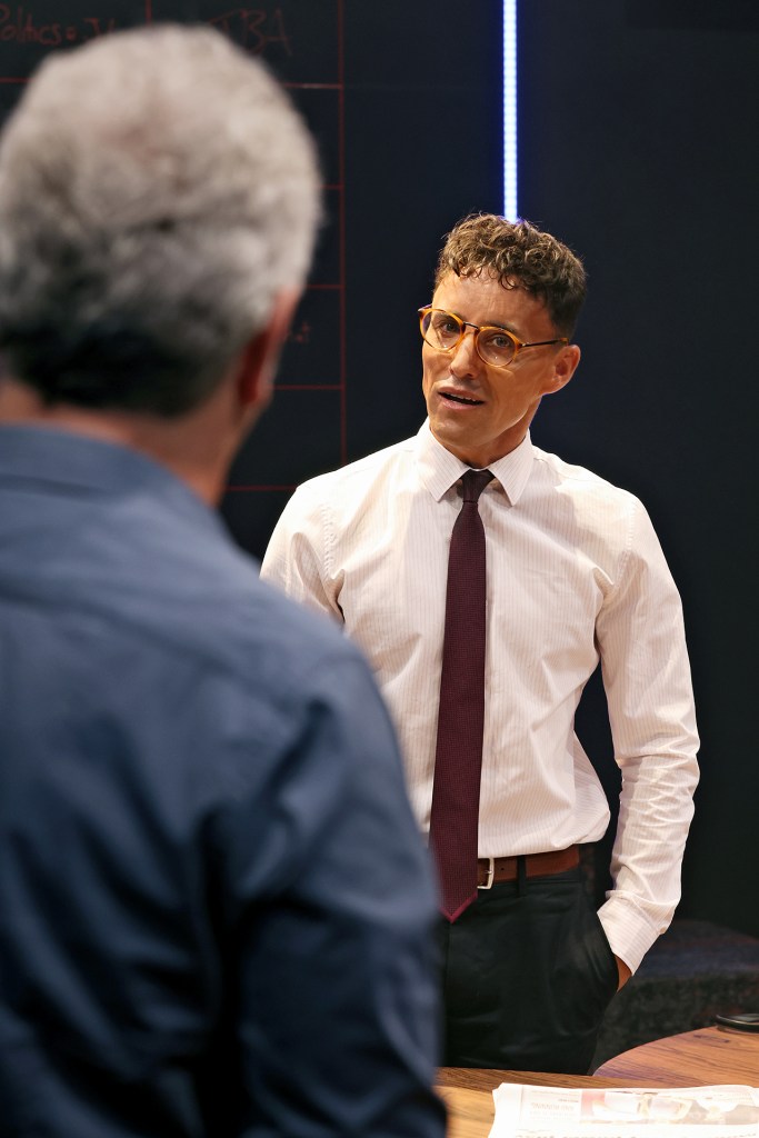Ensemble Theatre’s sets are some of my favourite in Sydney, and this one is no exception. The stage is minimalist in design, a couple of well-placed props such as microphones that rise and fall from the ceiling as needed, are all that is needed to have a big impact. Warm lighting and music reminiscent of shows like ABC’s Four Corners complete the design.