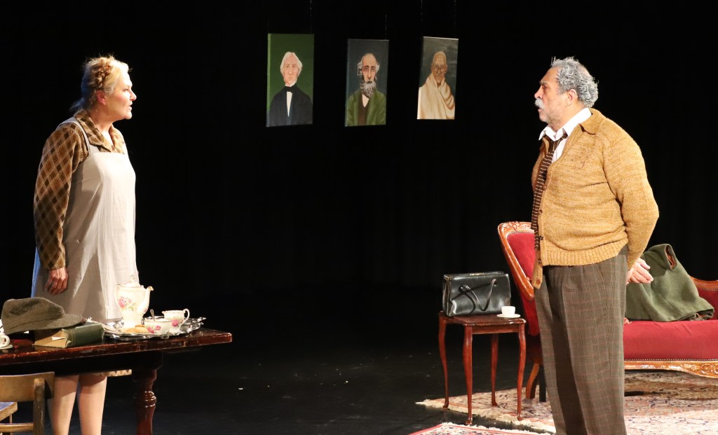 A boppy, Nindendo-y tune – the kind of music a Ted Talk will say helps you think – sets our scene; we’re in the year 1942 when we meet celebrated physicist Albert Einstein (Nicholas Papademetriou) and Margaret (Nisrine Amine), a journalist determined to get an interview with the famous scientist and get to the root of Einstein’s family secrets; in particular, why he neglected his former wives and children, and a rumour that he had a secret daughter. Under the watchful eye of his overbearing housekeeper (Alison Chambers), Einstein and Margaret verbally spar on the question of what matters more – your achievements, or your relationships with others.