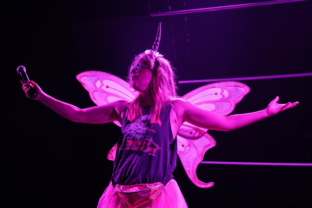 There’s just something innately funny in a woman unapologetically wearing a tiara and tutu with a black punk-rock singlet and singing sharp, often bleak lyrics that interchange fairy lore and family tragedy in an angry, deadpan tone. Fairy Sprinkles wants to be the picture of feminine perfection she gives to children but despairs at life outside of her fairy wings. Her anger is dominant but so is her vulnerability, coming through when a child sticks by her side for their whole party or her mother has an unexpected moment of lucidity, and you hope that Fairy Sprinkles’ tomorrow will be a whole lot better than today and yesterday.