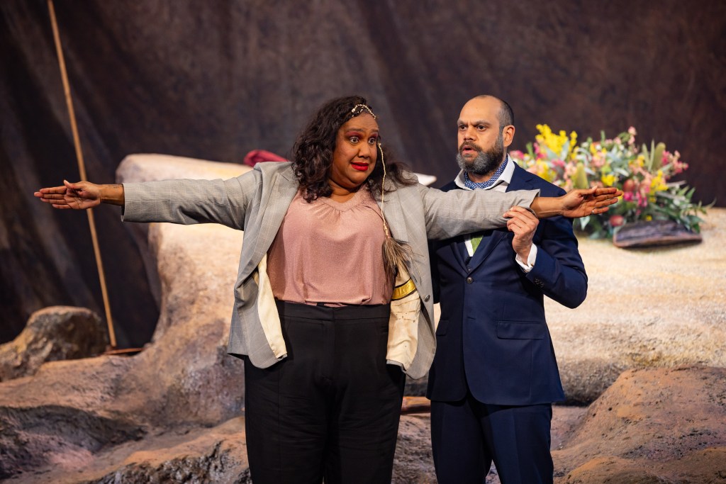At the same time, The Visitors presents history in a way that helps the audience understand it in modern terms. As it’s a story in which a group of leaders meet under clear professional protocols, discuss issues relevant to their peoples, and make decisions, the cast wears business clothes as they meet on the cliffs by the ocean. In facing unfamiliar people arriving from sea, their conversations span genuine consideration of the impact of their arrival and fear based on their skin colour, stereotypes each of them have developed through limited experience with previous visitors, a clear and uncomfortable parallel to conversations we hear about people from refugee, migrant and, still, Indigenous backgrounds today. It lets us relate to the story from our own lives, contrasts the moment in history and its continued impact and relevance to today.