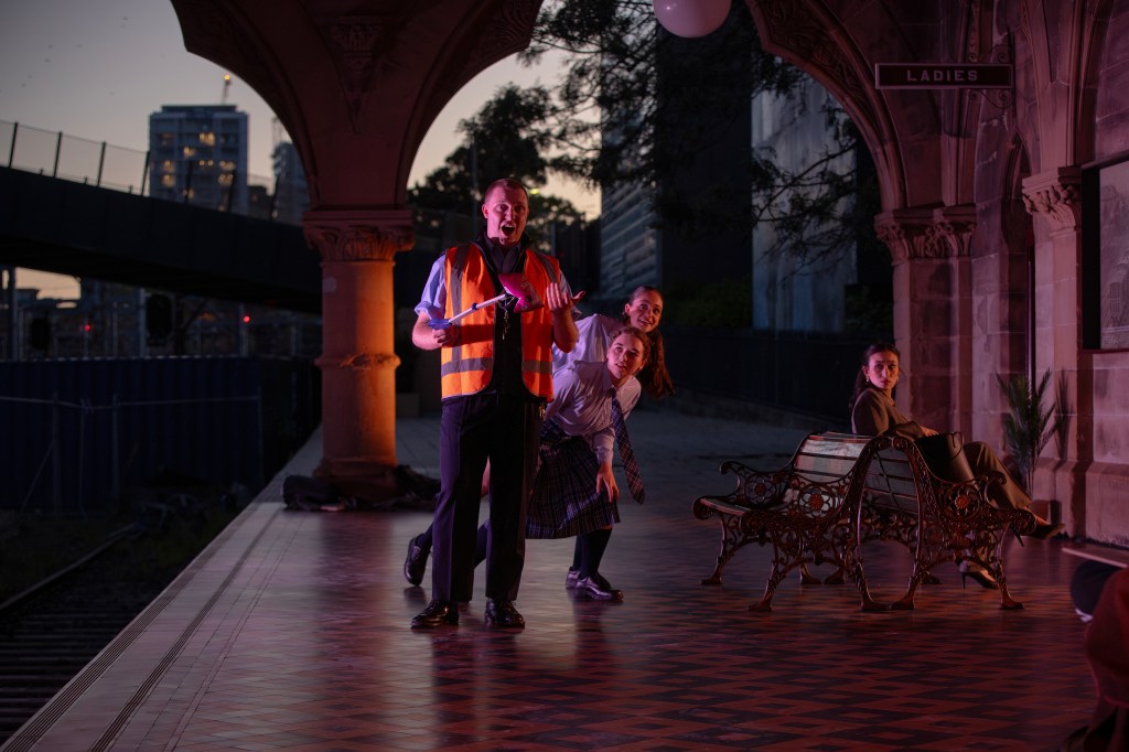 At Sydney’s stunning historic Mortuary Station, station master Bill (Michael Kaufmann), impatient career woman Jane (Anastasia Gall), homeless woman dreaming of being an artist Sam (Sophie Mohler) and bored schoolgirls Jess and Jo (Elizabeth Harper and Eden Shifroni) share the epiphanies one can have, and the mischief one can get up to, while waiting for the train via a jukebox musical of ARIAs from classic operas, including The Barber of Seville, La Traviata, La Boheme and Madam Butterfly.