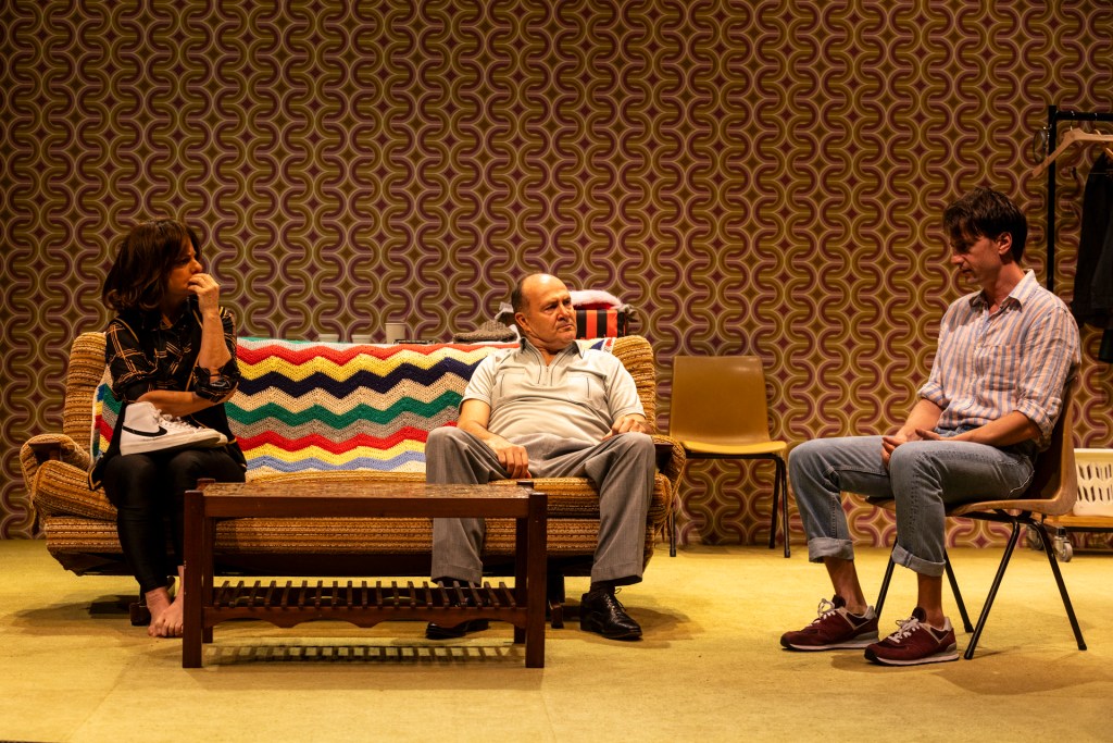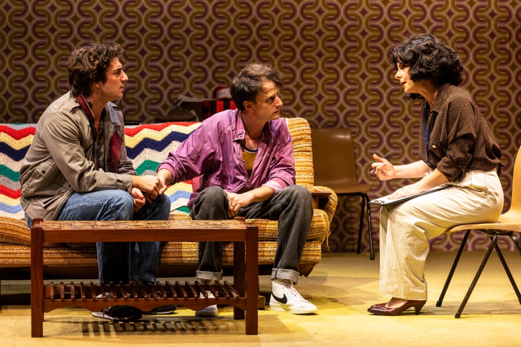 Flack’s direction and the exceptional work of set designer Stephen Curtis, lighting designer Phoebe Pilcher and composer/sound designer Alyx Dennison lure you into a bright and sunny world of teenage hormones, lust and love. 1960s homophobia is mostly drowned out by John and Tim’s playful eagerness to work out what it means to be gay together, though of course it is a constant theme. The orange set, fitted with mismatched, colourful lounges, the warm yellow lighting and cheery music really makes it seem like everything might be okay. Then comes the 1980s, and a palpable shift comes across the stage. The lights are starker, the music has an edge to it. The set keeps its colour but the characters lose theirs.